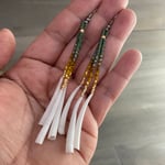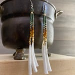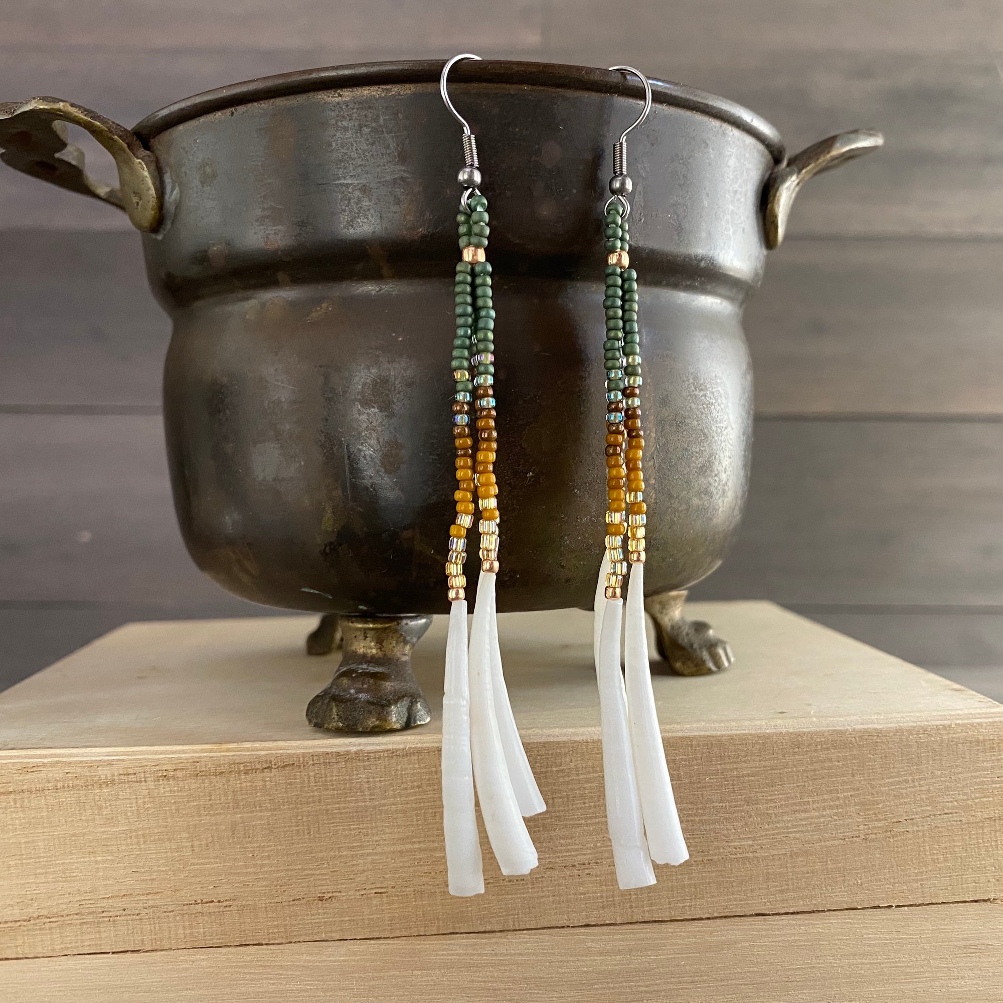 Golden olive and dentalium shell - seed beaded earrings