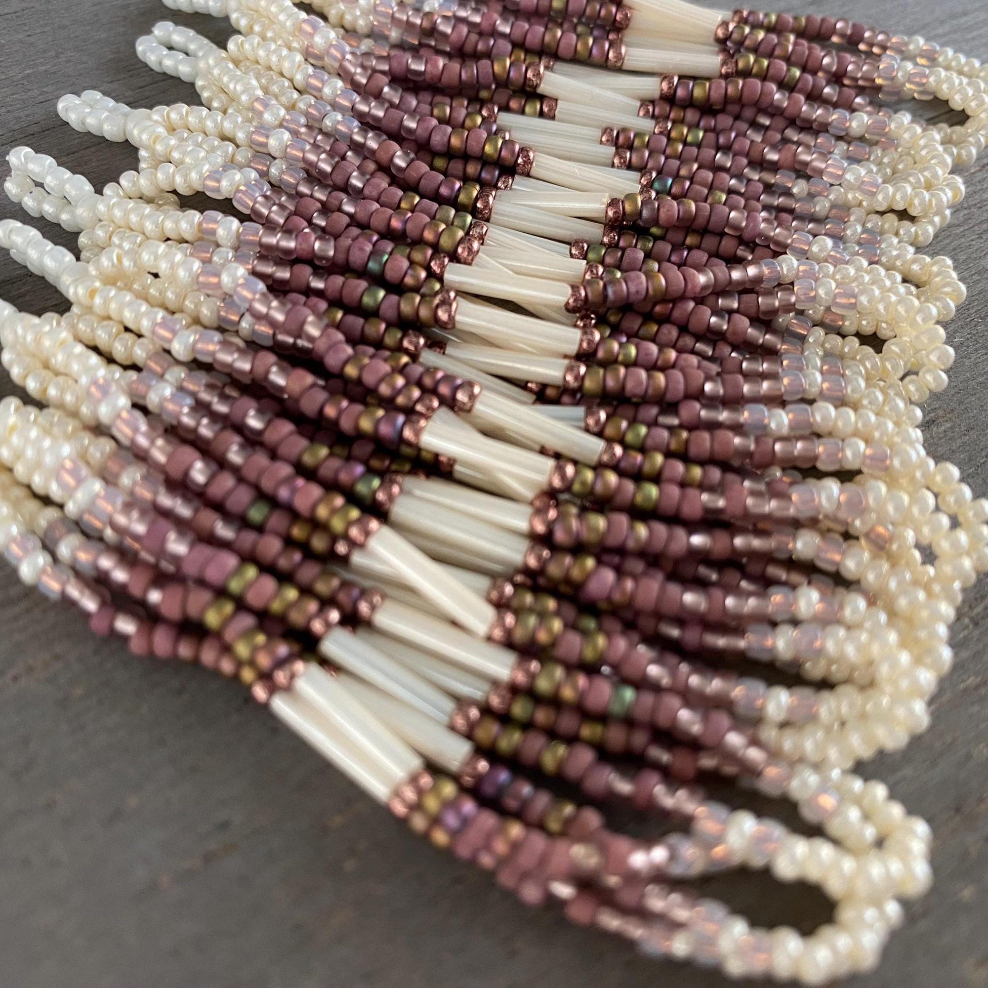 Ombre coppery pinks and mauves fading to matte iridescent, earthy-color shifting seed beads.