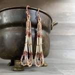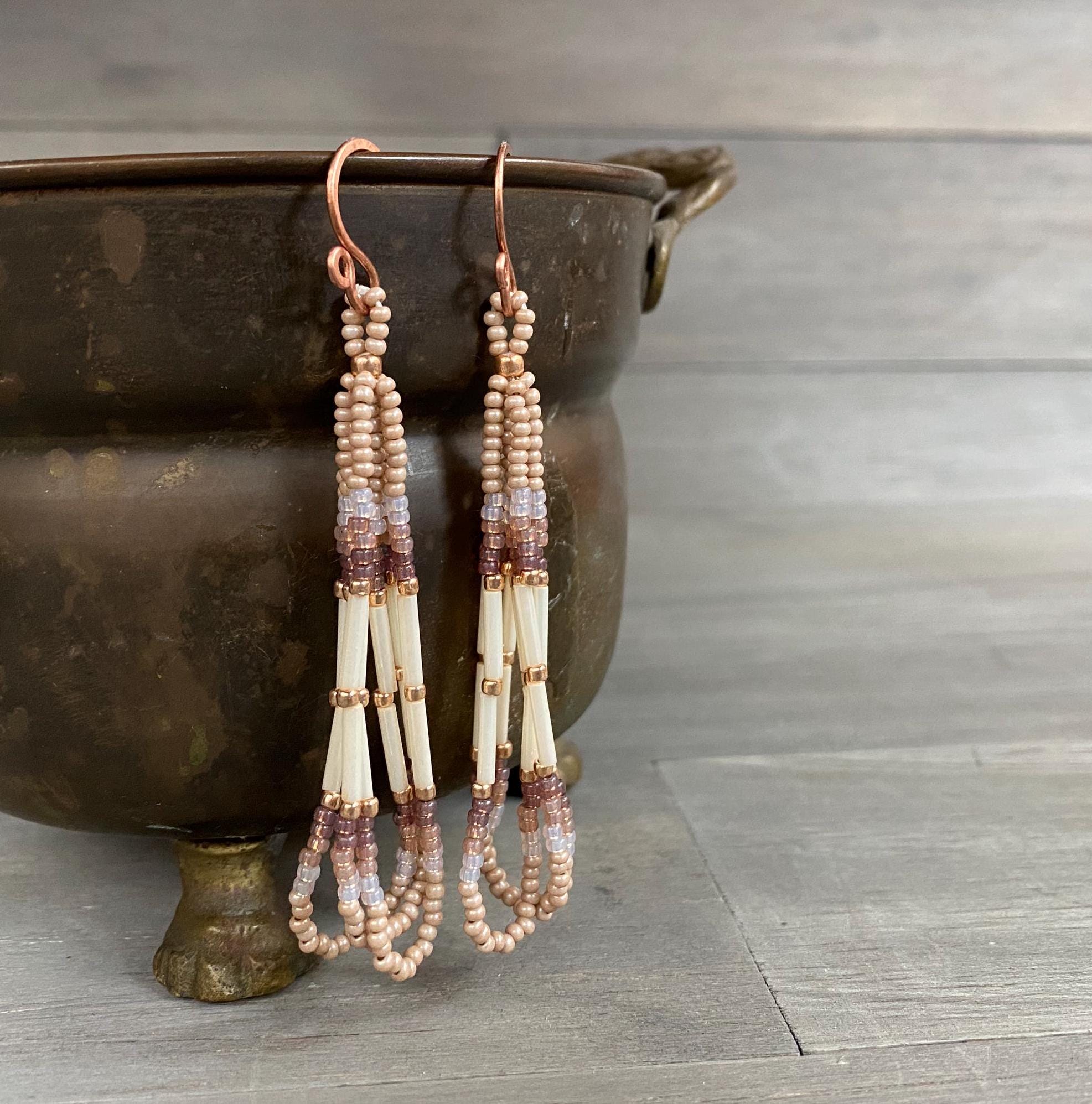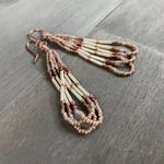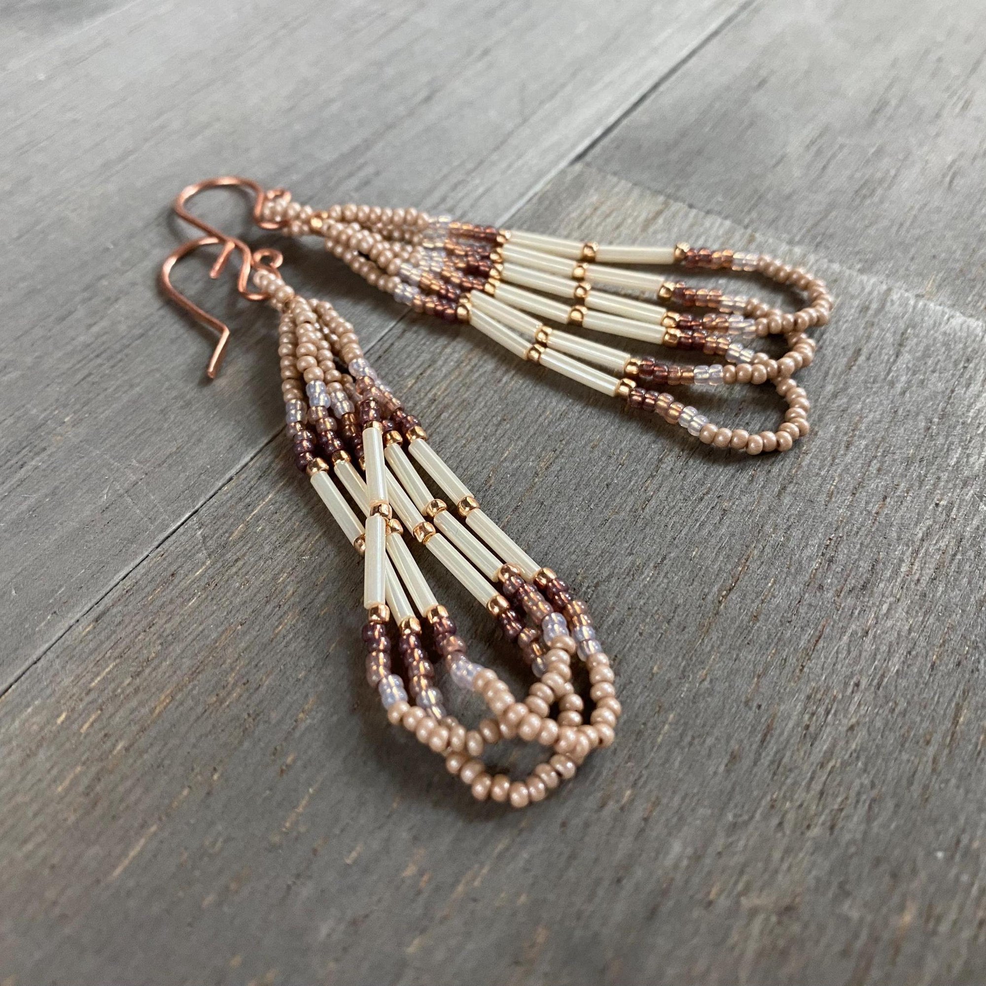 Pearly cappuccino seed beads are accompanied by a glimmering brown ombre patter and petite vintage cream bugle beads and rose gold accents.