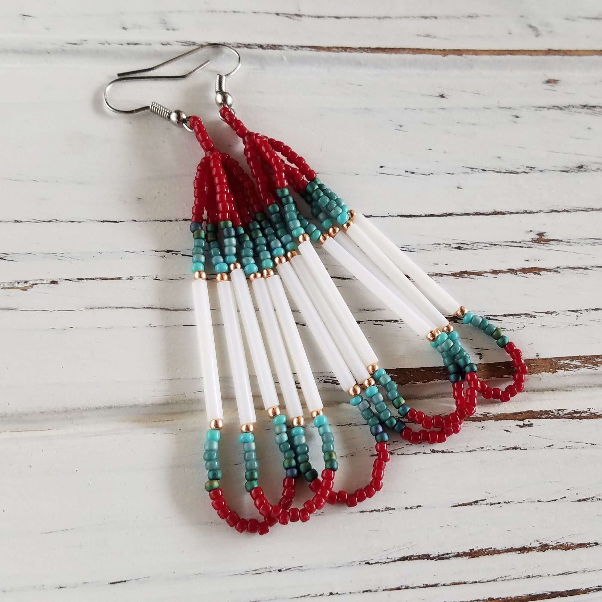 Deep brick red and a gradient of turquoise, punctuated by gold accents and white bugle beads.