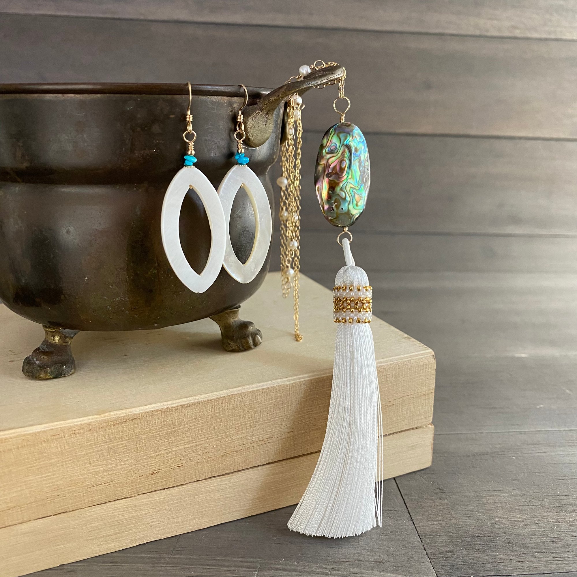 There is necklace that would complement these earrings well that is also available in my shop. It's a long, claspless, layering-friendly gold necklace with hand wrapped white pearls, an abalone pendant and peyote stitched white tassel. All metals are 14k gold filled as well.