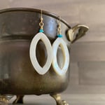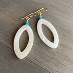 Bright white mother of pearl beads are topped with petite Sleeping Beauty Turquoise. All metals are 14k gold filled.